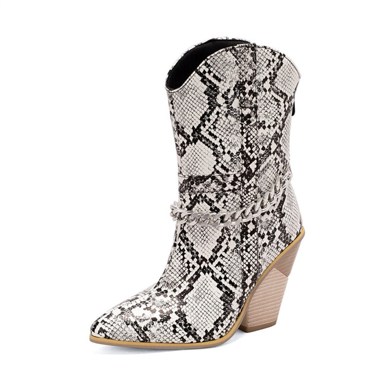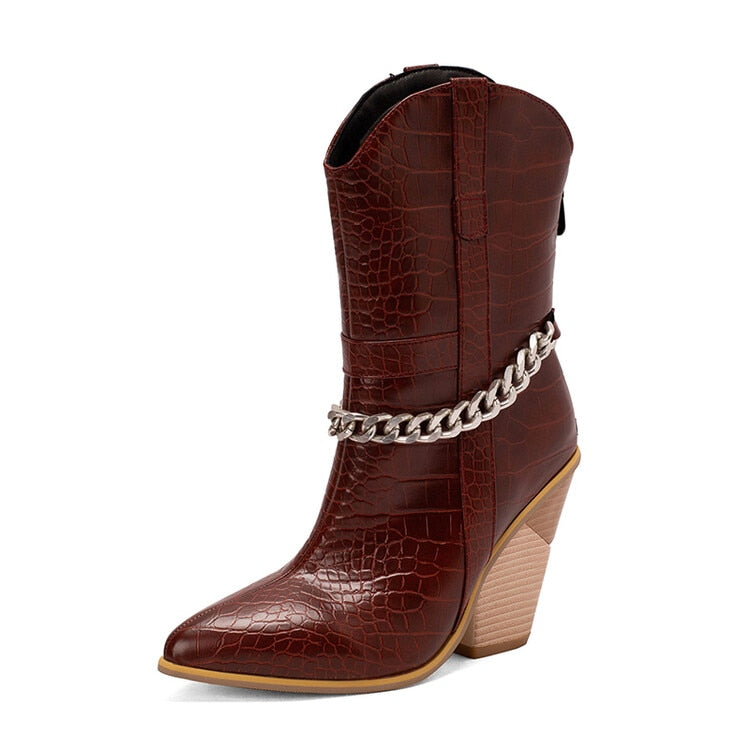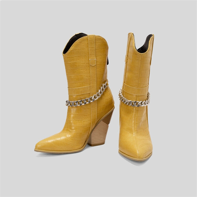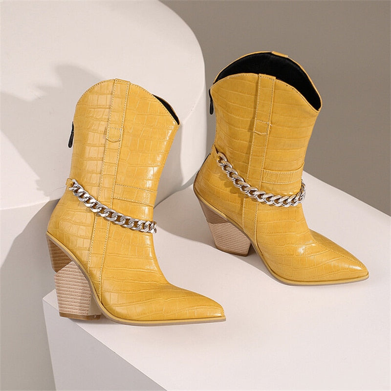 Step into the latest trend with our Chained Western Ankle Boots - Fern and Oak. These boots feature a metal chain accent, pointed toe, and a 10cm non-slip rubber heel for stability and are available in Black, Pink, Brown, Snake Skin, White and Yellow. The back zipper makes them easy to wear, while adding a high fashion twist to the classic cowboy boot. Elevate your style this season so that you are always ready "for a real live hoedown".