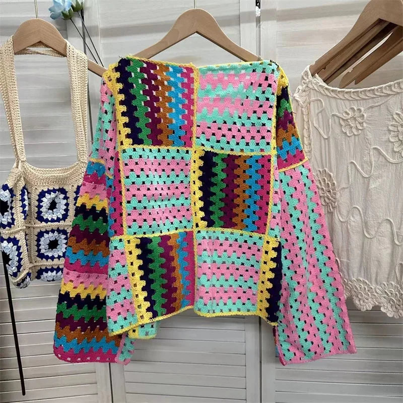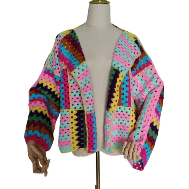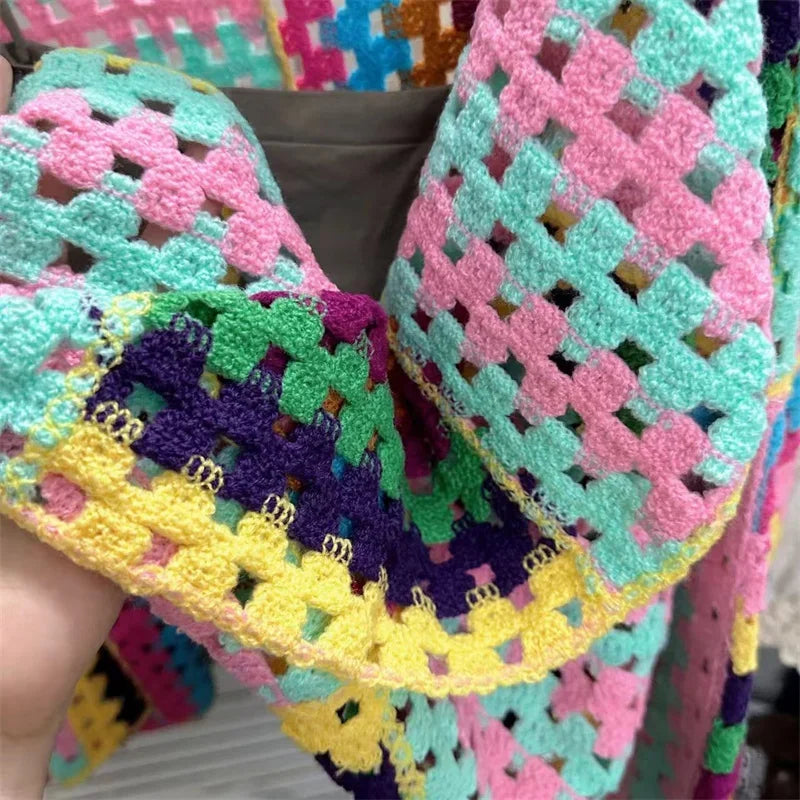 Introducing the Trinket Rainbow Crochet Cardigan Sweater from the Crochet Couture collection by Fern and Oak. Elevate your wardrobe with this must-have addition, perfect for any occasion.