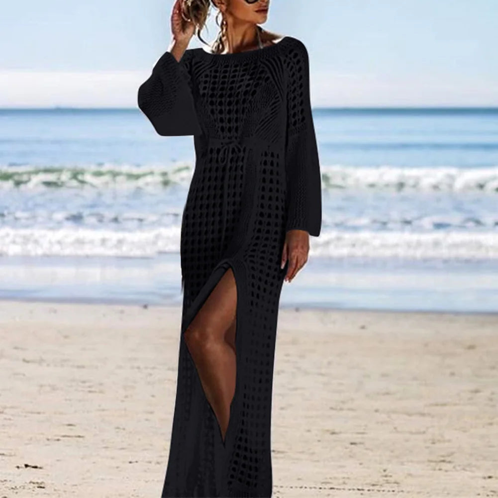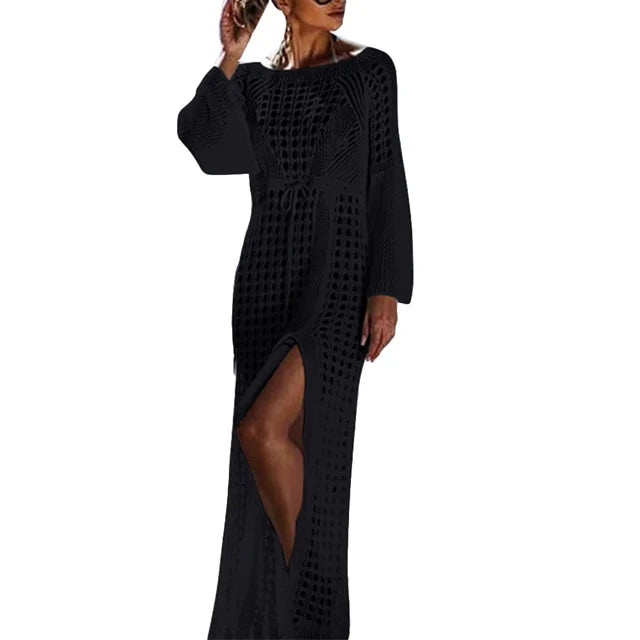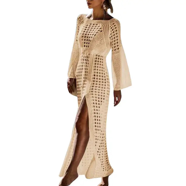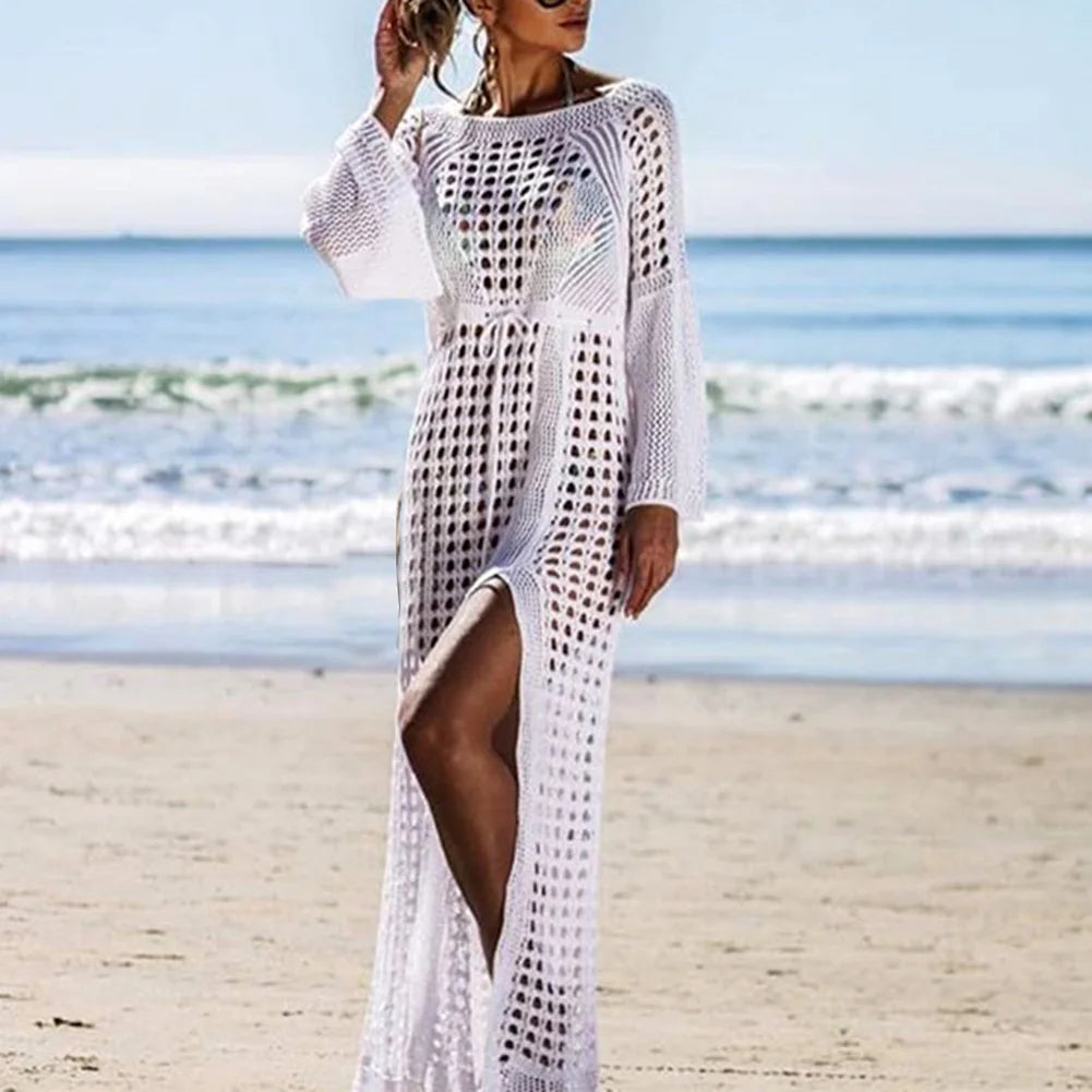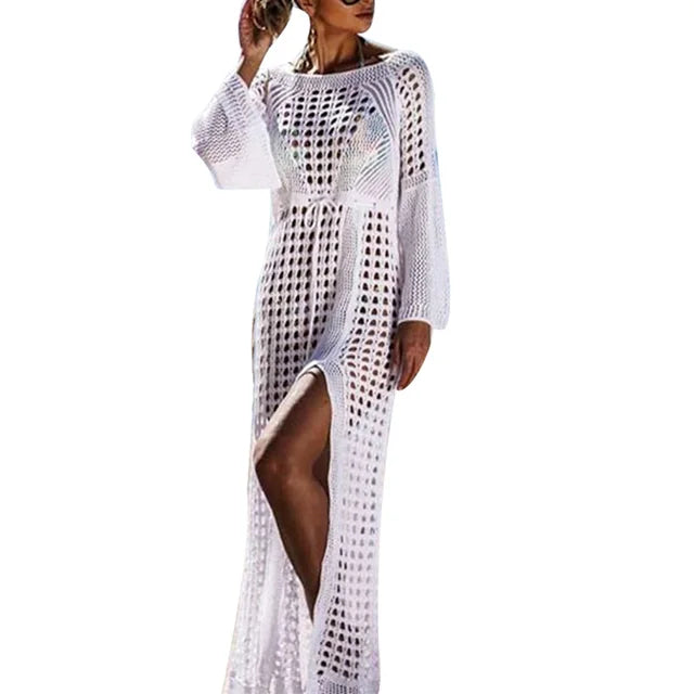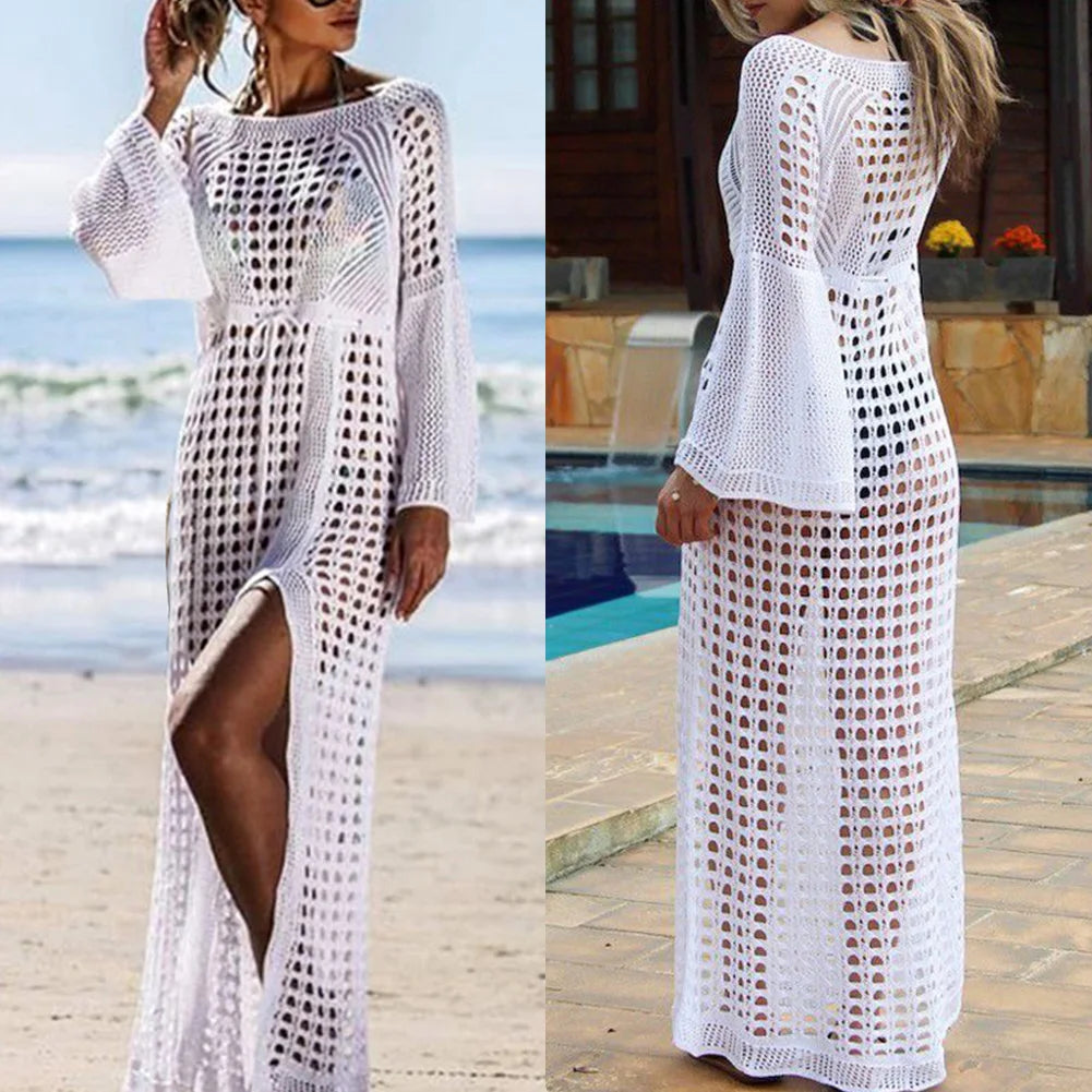 2019 Fashion Summer Women Crochet Sexy Hollow Knitted Long Sleeve High Split Bikini Cover Up Beachwear Party Maxi Dress Vestidos