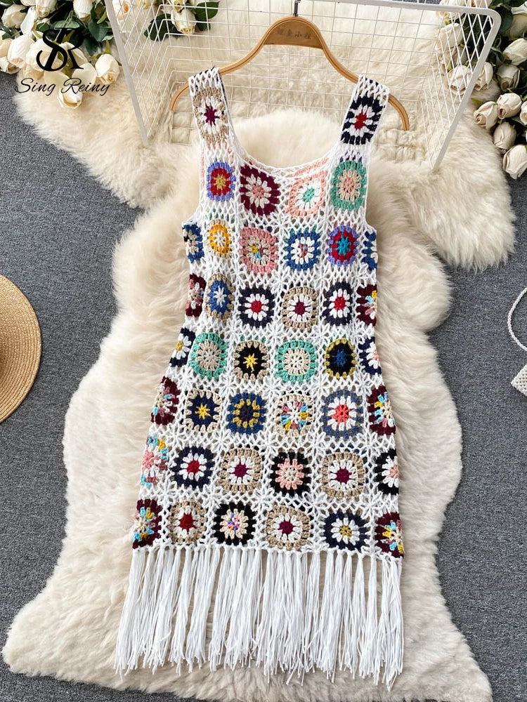 Elevate your summer style with our Crocheted Swing Dress Beach Cover-Up by Fern and Oak. This original design features a hook flower and crocheted pattern, adorned with tassels for a touch of vintage charm. Stay cool and stylish all season long with this slim-fitting dress, perfect for any beach or streetwear look.
