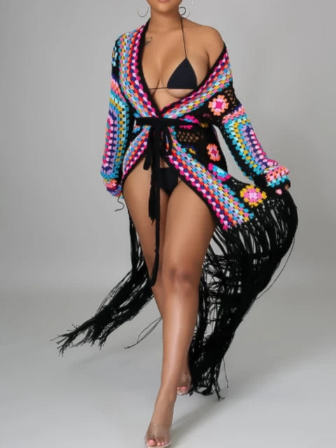 Elevate your beach style with our Crocheted Tie-up Tasseled Cardigan from the crochet couture collection. This versatile coat features a mix of colors, loose and irregular tassels, and a hand-hooked design for a unique and trendy look. Perfect for a day at the beach or as a stylish cover-up, it's a must-have for any fashion-forward individual or for the festival season! We recommend sizing up for a comfortable and light fit.