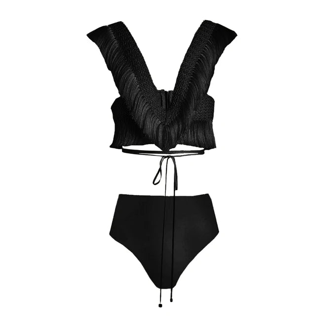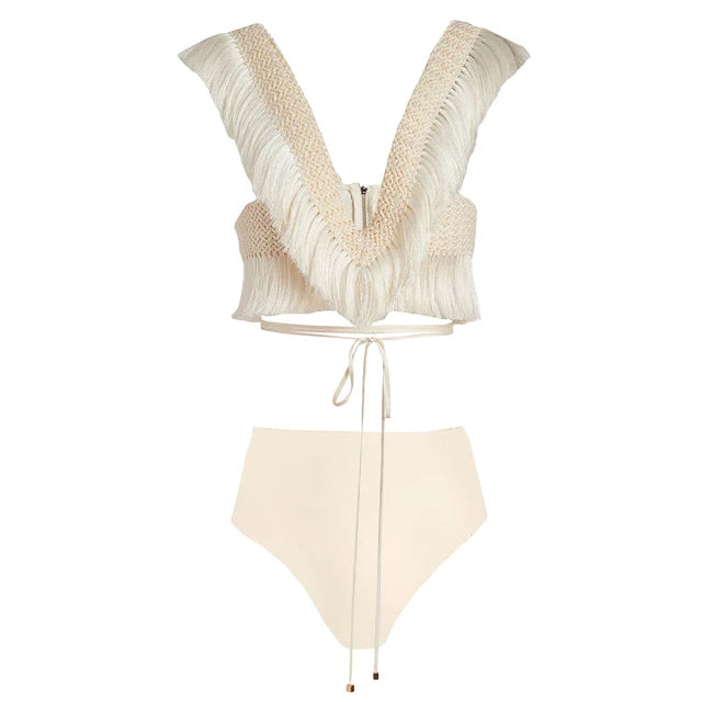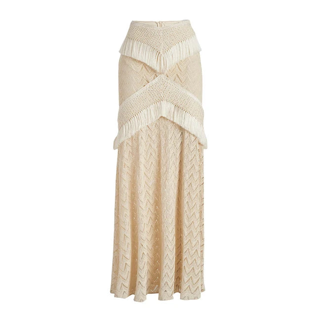 Embrace the beauty of nature in the Fringed Knit Halter and Skirt by Fern and Oak from the Crocheted Couture vibe. Made with a nostalgic knit fabric, this outfit features a V-neck halter and high waist skirt with charming fringe details. Perfect for summer, this crocheted couture piece is a whimsical addition to your wardrobe and is designed to be a complete beach-wear outfit. Available in Black or White.