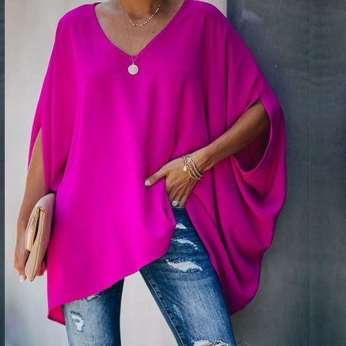 This Pink Women's Loose Bat Sleeve V Neck Shirt is perfect for casual wear. Made from lightweight chiffon, the long shirt features a flattering V-neck and loose batwing sleeves. It pairs perfectly with leggings, making it a versatile and comfortable choice. Dress it up or down for any occasion. Available in a variety of colors, including pink as part of the Fern and Oak On Wednesdays, We Wear Pink Collection.