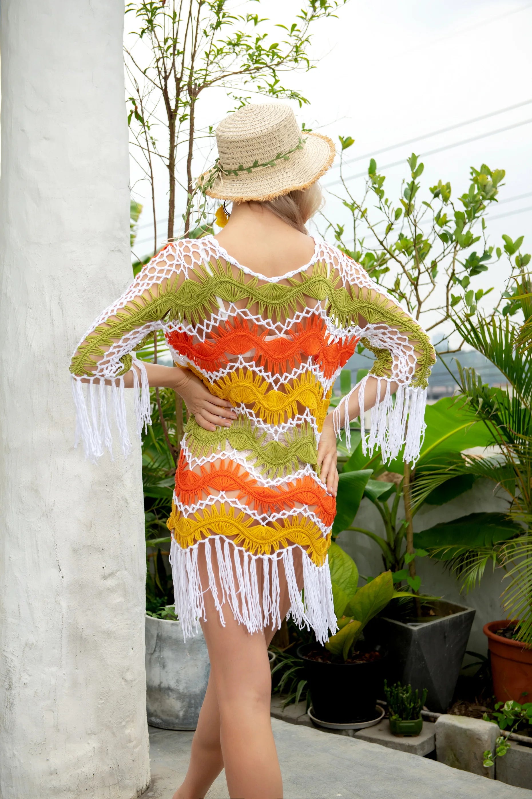 Upgrade your beach look with the Striped Fringed Crochet Dress Beach Cover-Up by Fern and Oak's new Crocheted Couture vibe. Bold stripes of color and intricate crochet detailing make a statement while keeping you comfortable. Embrace the new vibe and feel empowered in this must-have cover-up.