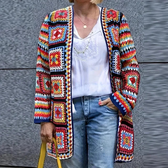 Introducing our Sweet Squares Crocheted Open Sweater in Fern and Oak. Stay cozy and stylish with this vintage-inspired sweater featuring a beautiful embroidered colored geometry print.
